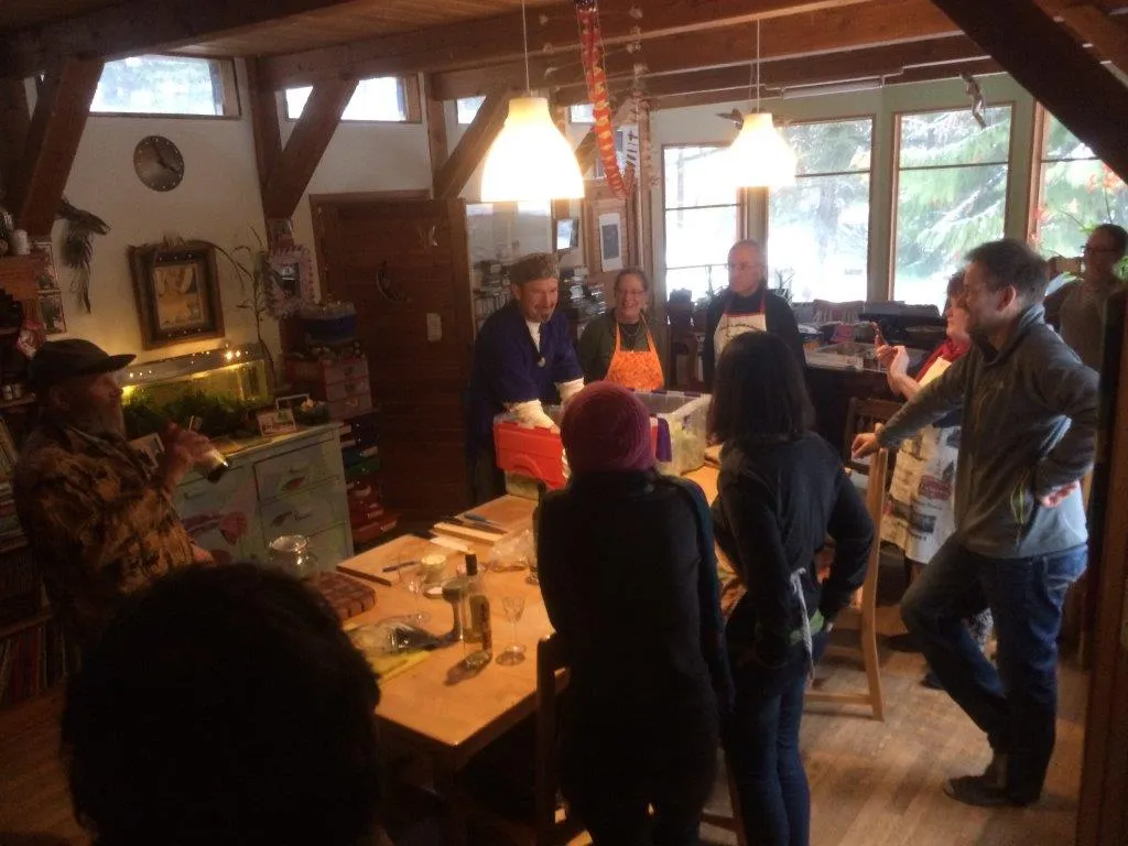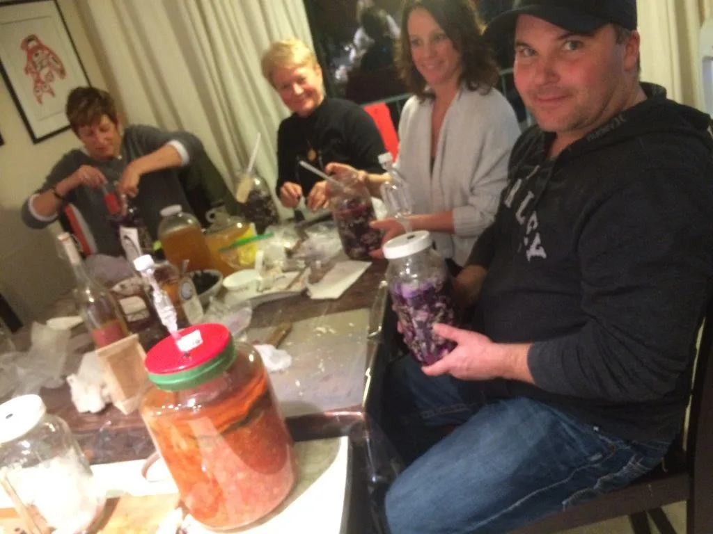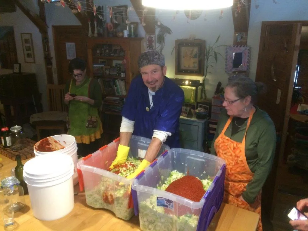 Cabbage and seaweed will be prepared the evening before class by Daniel & Tennille. Attendees will be expected to help cut wilted cabbages, scrape ginger, husk garlic, and stuff jars. A few extra cutting boards and knives, plus a jar you can fill to take home if you chose not to purchase the reusable ferment kits available. It is a good idea to bring a “drop sheet”. That is a sheet or thin blanket placed all over the working area floor that will catch all the escaping veggie chunks, drips of sauces, etc. This makes for an easy cleanup and prevents messes spreading throughout house. If someone has two very large matching stainless steel mixing bowls, please bring for helping husking garlic.