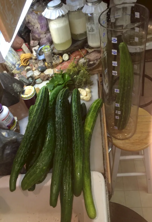 Sept 15: Big Larry, the World’s Largest Pickle to be, has been trying to escape! I just tossed a double fist sized quartz crystal on the top of the water filled baggies used to hold Larry’s neck submerged. If this won’t work thinking about siphoning brine from below to bring him gently to the bottom. His neck is already bent. Hmm… Can’t seem to be able to google advice… Go figure. I think Big Larry will lose most of his boyancy after the LABs finish eating the O2 and the released CO2 escapes.