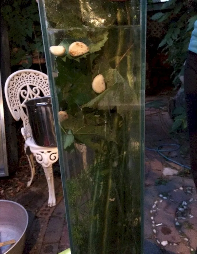 Loading up with dill, garlic, and lots of grape leaves that have tannins to prevent Larry from getting too mushy.