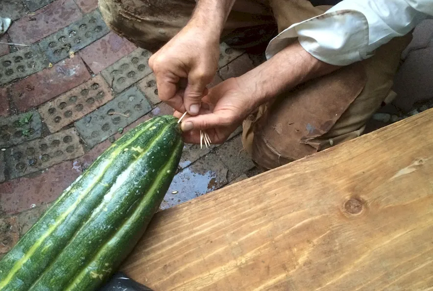 The embalment of Big Larry begins! A strong brine solution with a few old tea bags (tannins prevent mushy) is poured into him. and he is covered up until the new fermentation vessel is ready tomorrow. He will then complete his journey into adequate housing for metamorphosis into a pickle.