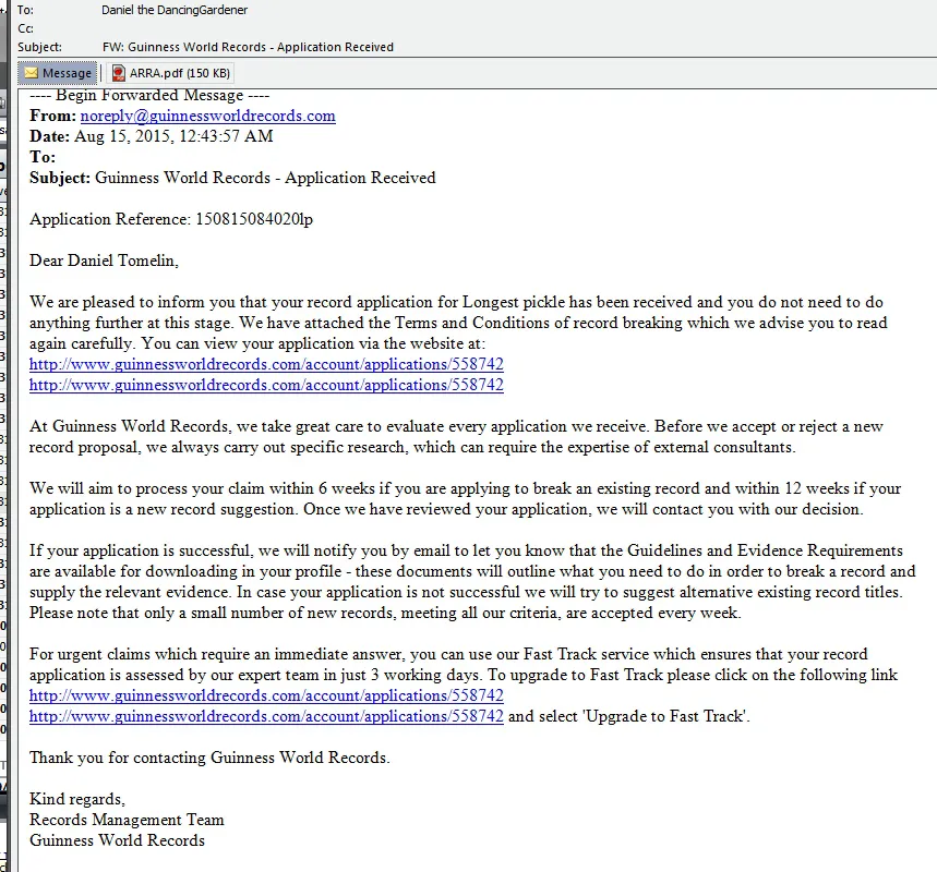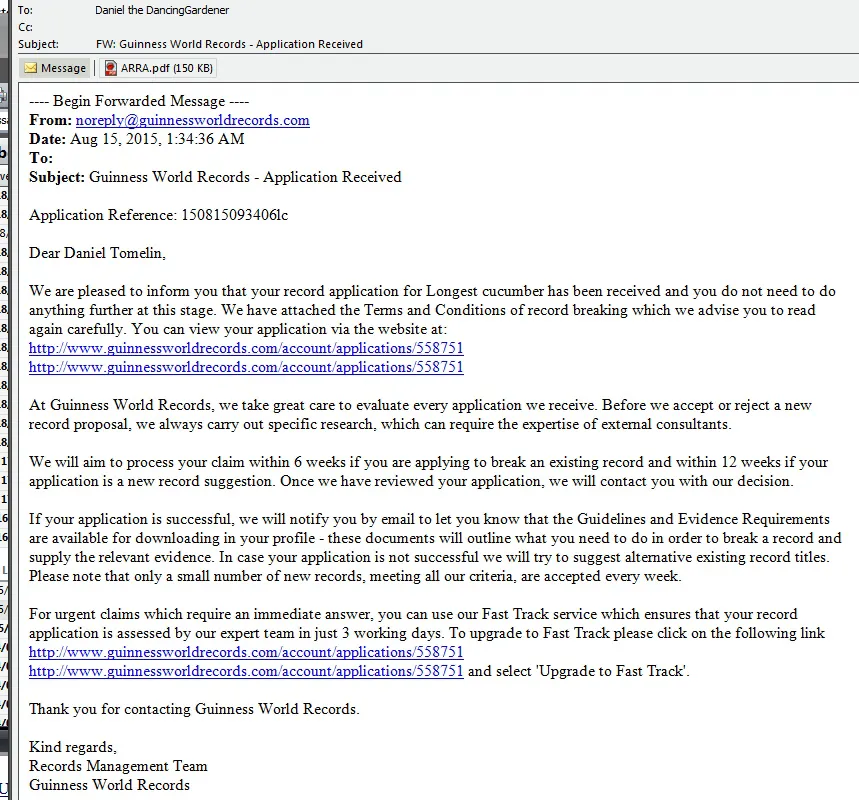 One cover letter explaining the context of the record attempt. Please indicate the date, time and exact location of the award, the name of the awarding body and judge (s), and the final measurements of the award-winning specimen.